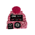 Hide & Seek “Wild Child” kid beanie in pink leopard with a rechargeable, removable LED. Pom accent, cozy knit, and easy-clean design for everyday adventures.